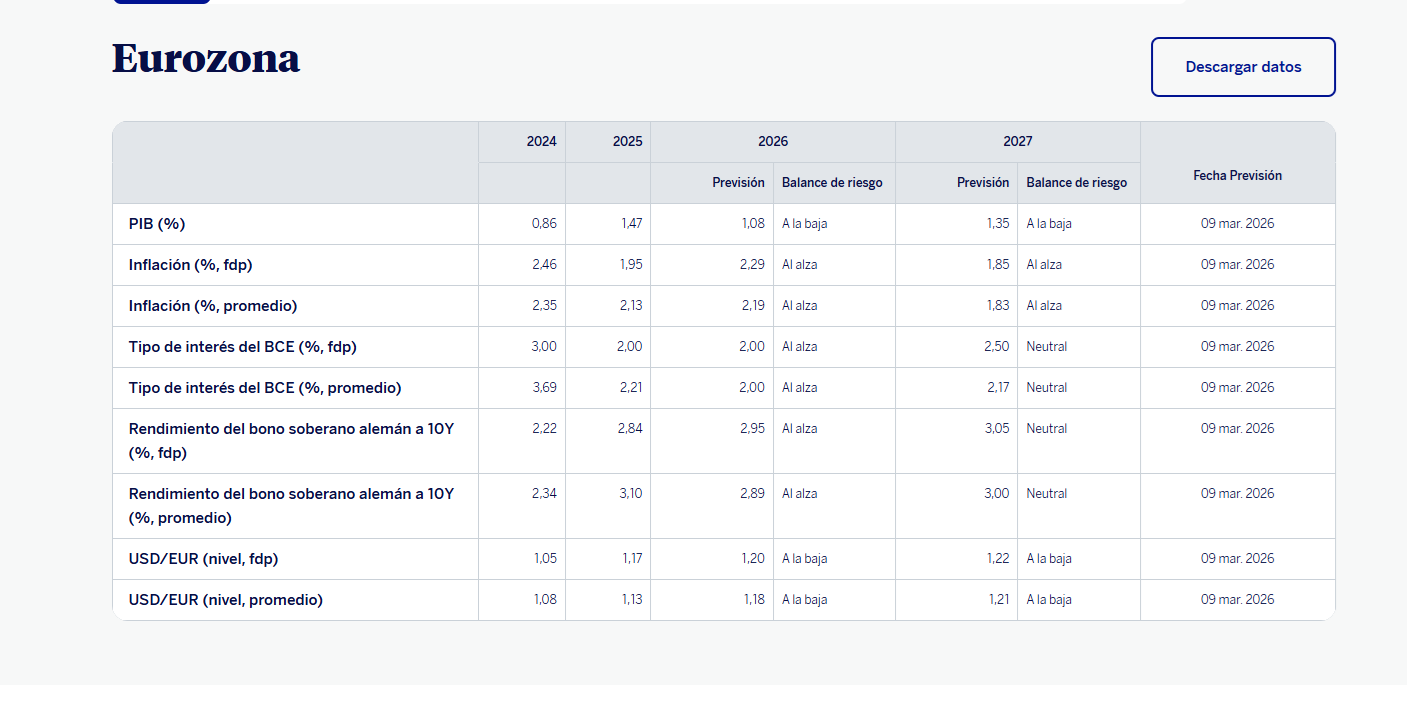 La sección presenta las previsiones anuales derivadas de los análisis económicos recientes. Permite seleccionar la geografía deseada para visualizar los datos específicos, destacando la información disponible para la Eurozona, así como las proyecciones publicadas sobre materias primas.